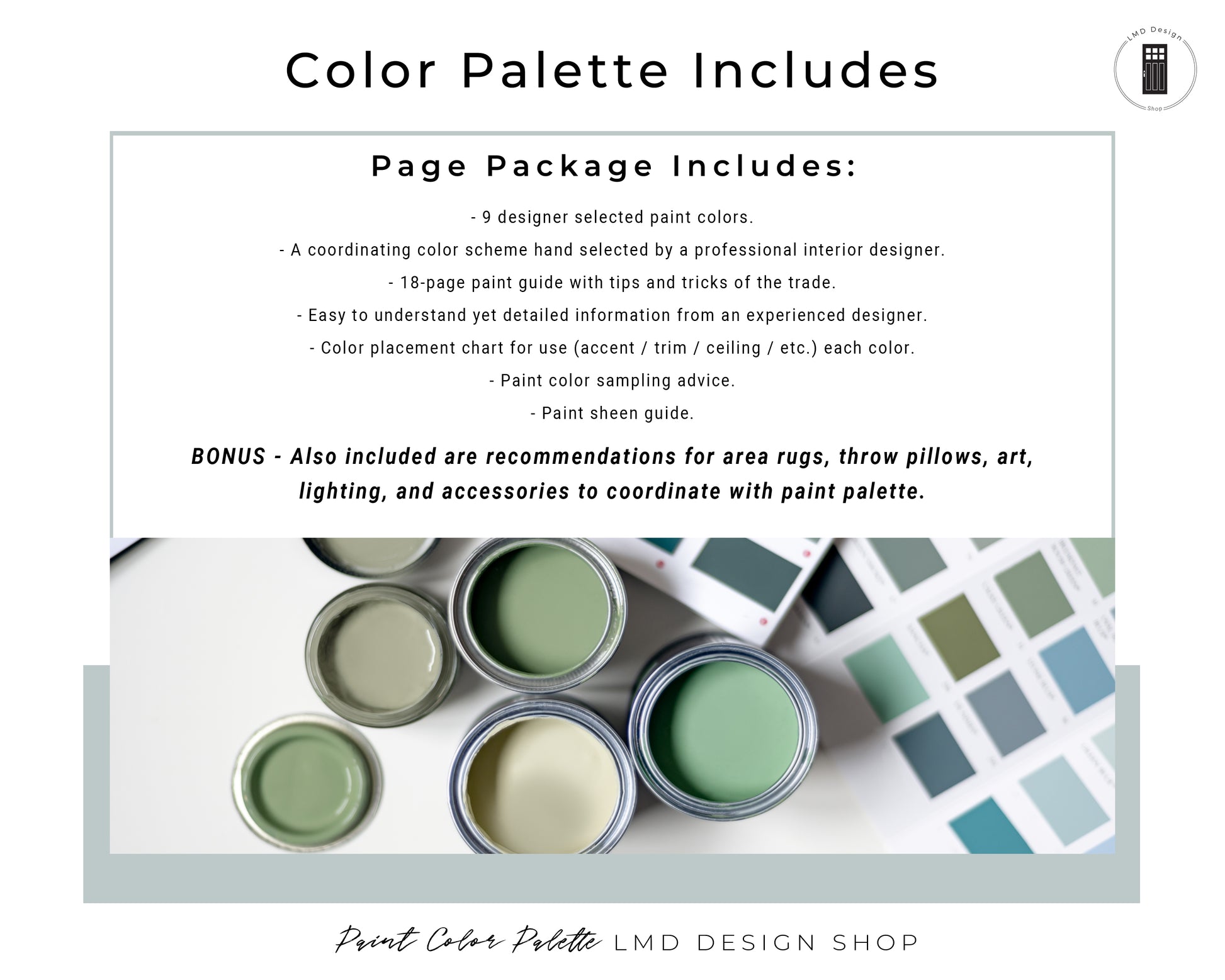 • Recommendations for area rugs, throw pillows, art, lighting, and accessories to coordinate with paint palette.