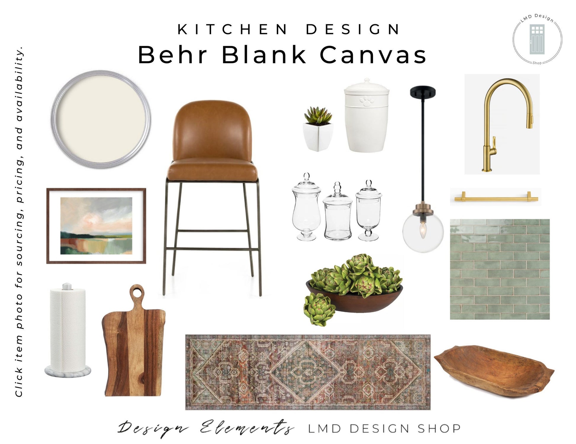 • Kitchen design to work with Blank Canvas cabinet color included with a clickable shopping list.