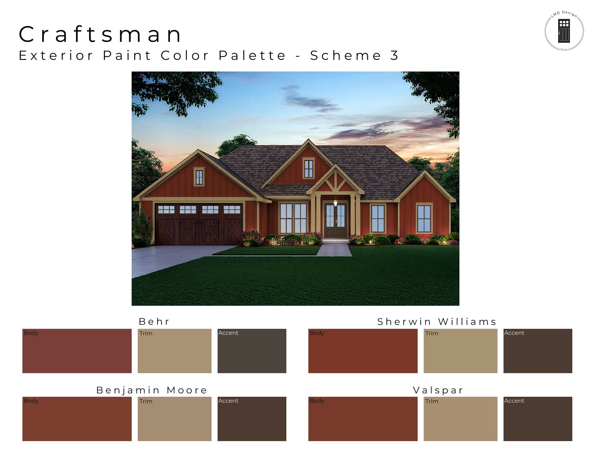 This listing is for six Craftsman style pre-made exterior paint color schemes. The color schemes shown on the listing rendering (cover) are the palettes you will receive but with the paint color details (name and color number) shown upon purchase.