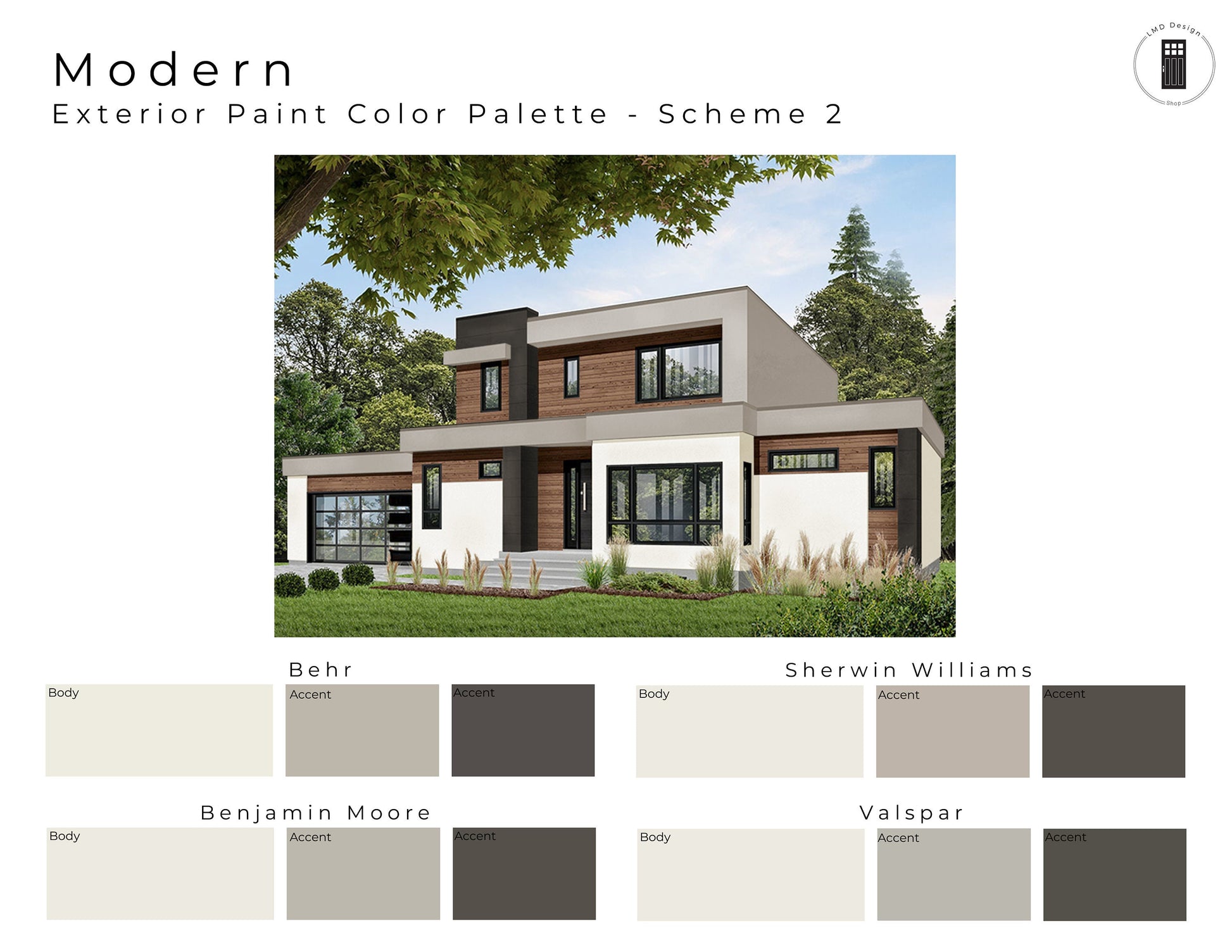 This listing is for six Modern style pre-made exterior paint color schemes. The color schemes shown on the listing rendering are the palettes you will receive but with the paint color details (name and color number) shown upon purchase.