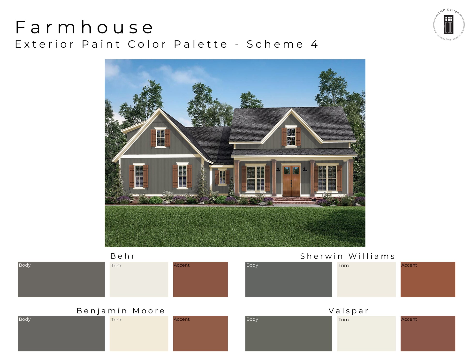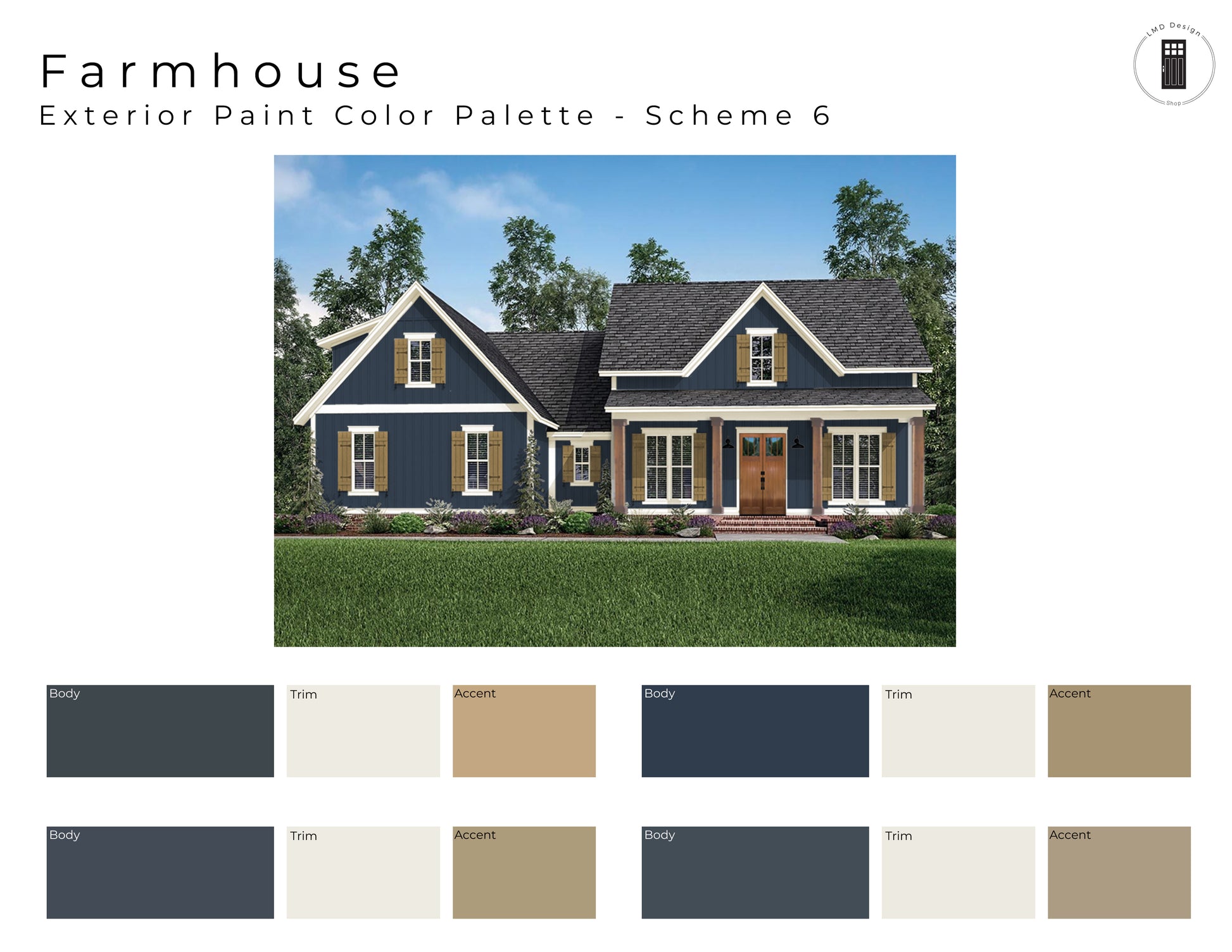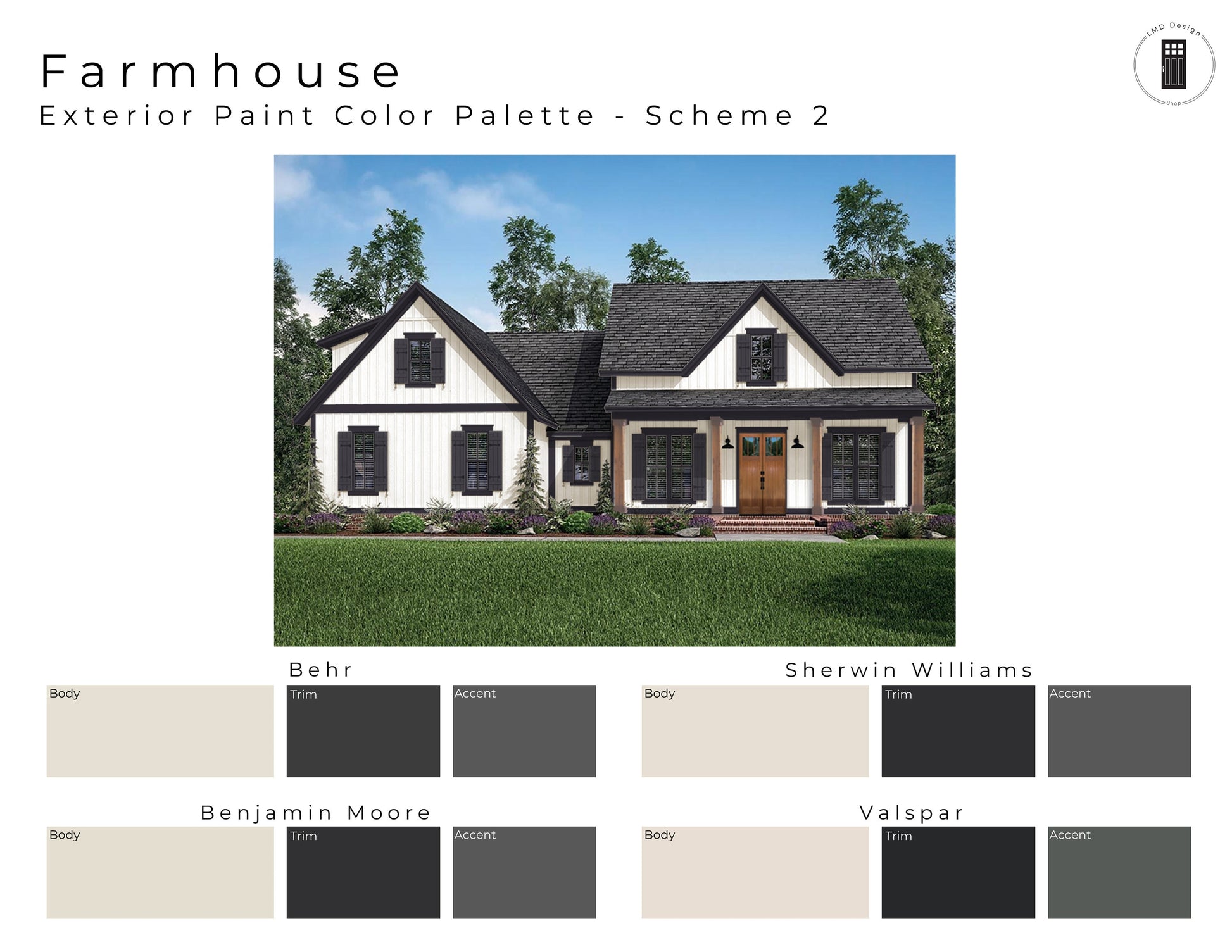 This listing is for six Farmhouse style pre-made exterior paint color schemes. The color schemes shown on the listing rendering (cover) are the palettes you will receive but with the paint color details (name and color number) shown upon purchase.