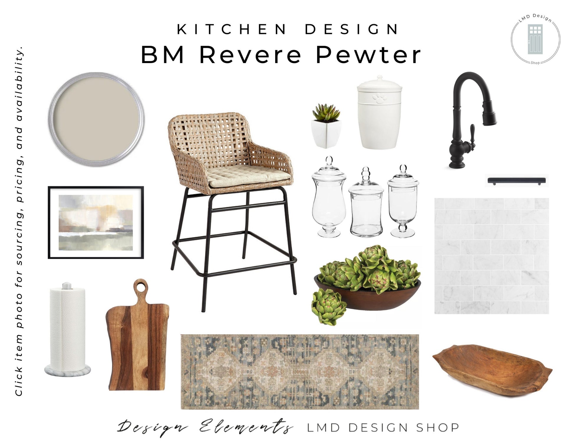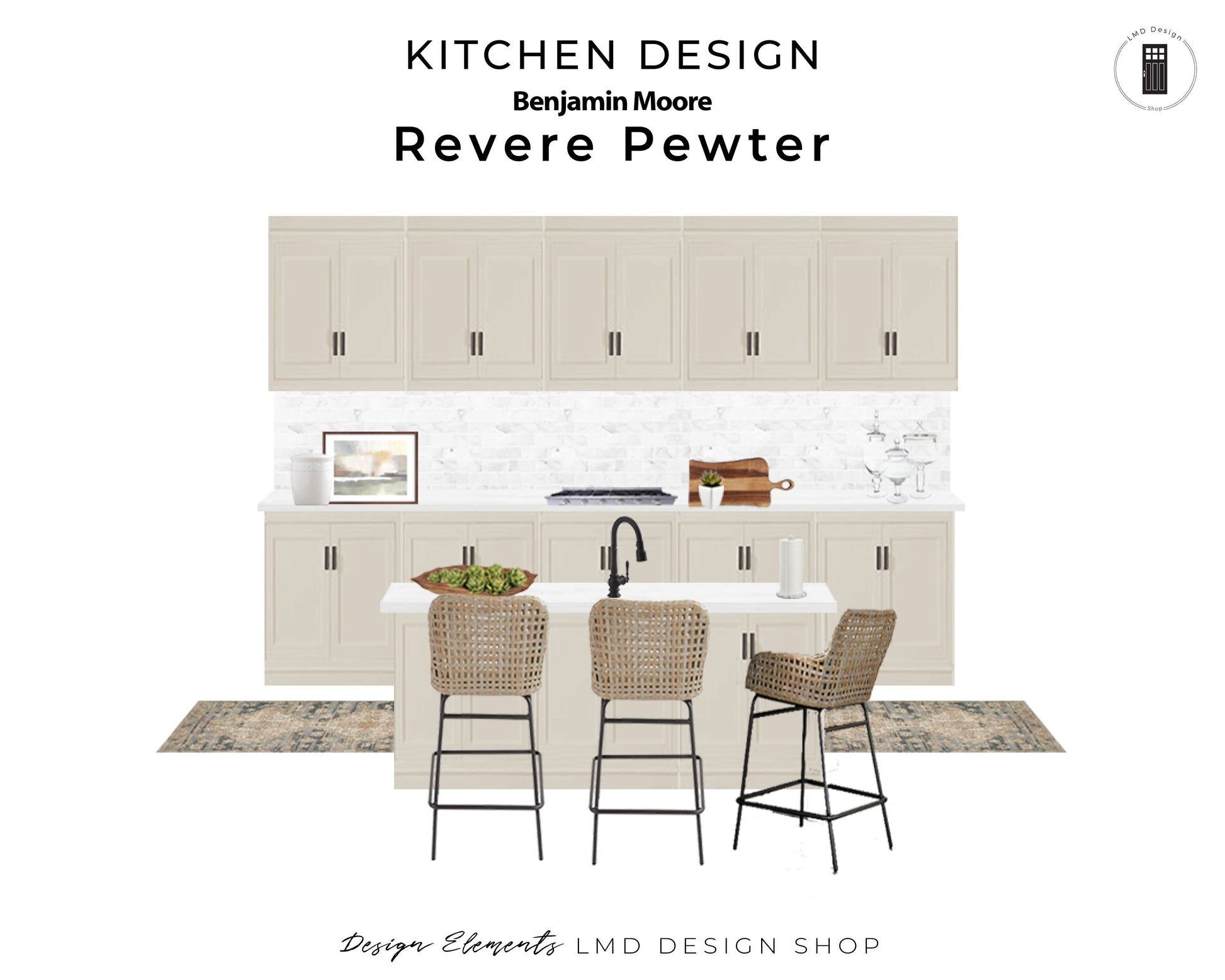 • Kitchen design to work with Revere Pewter cabinet color included with a clickable shopping list.