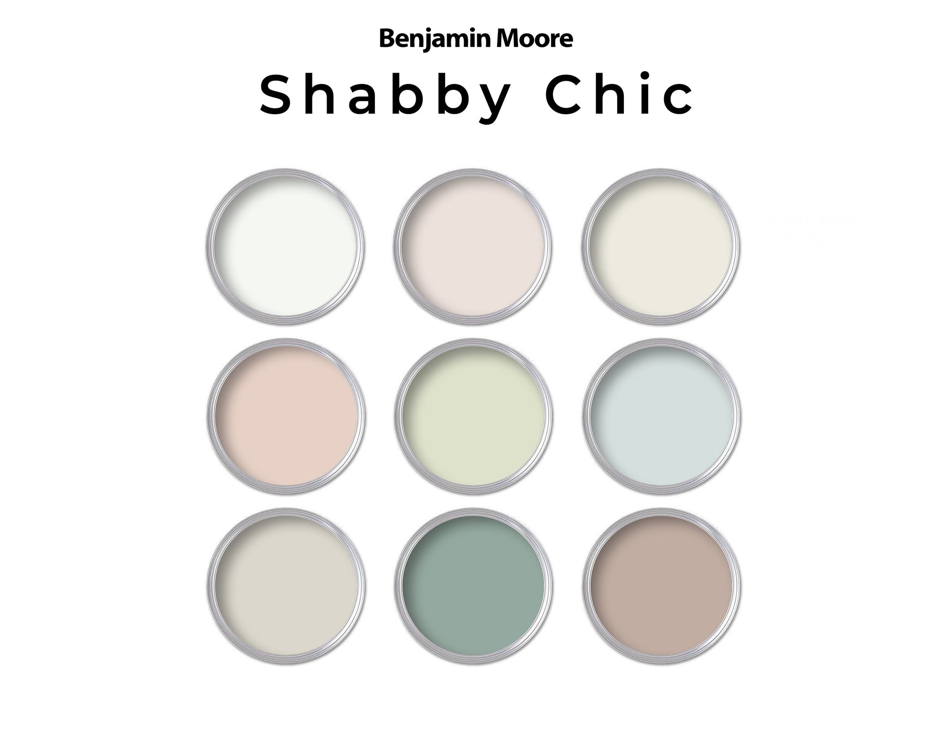 Shabby Chic Benjamin Moore paint palette features soft, muted pastels and neutral tones that convey a relaxed and vintage aesthetic.